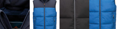 Main: 63% Polyester, 37% Recycled polyester. Panels: 50% Polyester, 50% Recycled polyester. Lining: 100% Recycled polyester. Water-repellent polyester micro poplin. Mechanical stretch softshell on side panels for improved fit and freedom of movement. One zipped chest pocket and two lower zipped pockets. Stretch binding to armholes and hem. Concealed zip entrance in lining for embroidery access. Contains recycled polyester.