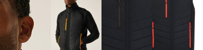 93% Polyester, 7% Elastane. Lightweight four-way stretch outer fabric with durable water-repellent finish. Warmloft insulation, 160gsm. Certified to EN ISO 20471:2013+A1:1026 Class 1. One zipped chest pocket and two lower zipped pockets. Internal pocket. Fleece-lined collar. Stretch binding to armholes and hem. Concealed inner zip for embroidery access. Darker contrast panels, ideal for dirty environments.